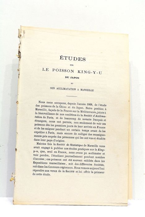 in-8. 1f. de garde. 15pp. Broché. Feuillets en partie déreliés. Histoire naturelle. Zoologie. Chine. Japon. Marseille.
