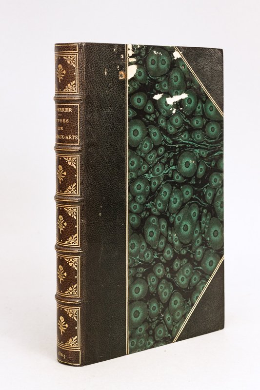 1 vol. in-8 reliure demi-maroquin à coins brun, dos à 5 nerfs dorés orné, tête dorée, Librairie de L. Hachette et Cie, Paris, 1863, viii-388 pp. Etat satisfaisant (petits accrocs au premier plat, qq. rouss.,dos passé mais belle reliure par ailleurs). Né à Châlons-sur-Marne, Charles Perrier (1835-1860) publia dans le journal "l'Artiste" puis collabora à la "Revue Contemporaine" ; ses commentaires sur l'Exposition universelle de 1855 et sur l'Exposition de 1857 furent remarqués. dans la présente étude, il évoque notamment les artistes suivants : Ingres, Delarcoix, Paul Delaroche, Ary Scheffer, Horace Vernet, Decamps, Bouguereau, Paul Baudry, Courbet, Biard, Gustave Doré, Yvon, Clésinger, Cornelius, Overbeck, Schnorr de Carolsfeld, Kaulbach, Landseer, Mulready, Leslie, Webster et les Préraphaëlites