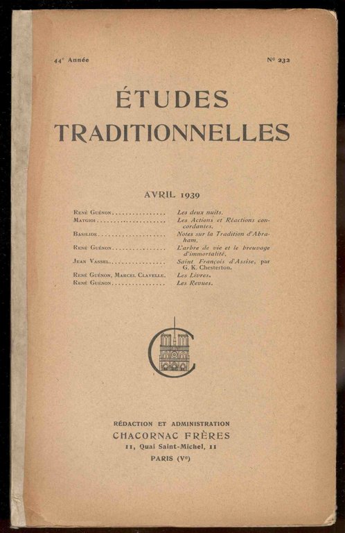 Études Traditionnelles. 44e année. Numero 232. Avril 1939