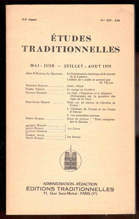 Études Traditionnelles. 74e année. Numero 437-438. Mai-Juin - Juillet-Aout 1973