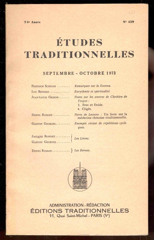 Études Traditionnelles. 74e année. Numero 439. Septembre - Octobre 1973