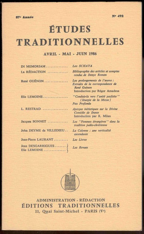 Études Traditionnelles. 87e année. Numero 492. Avril-Mai-Juin 1986