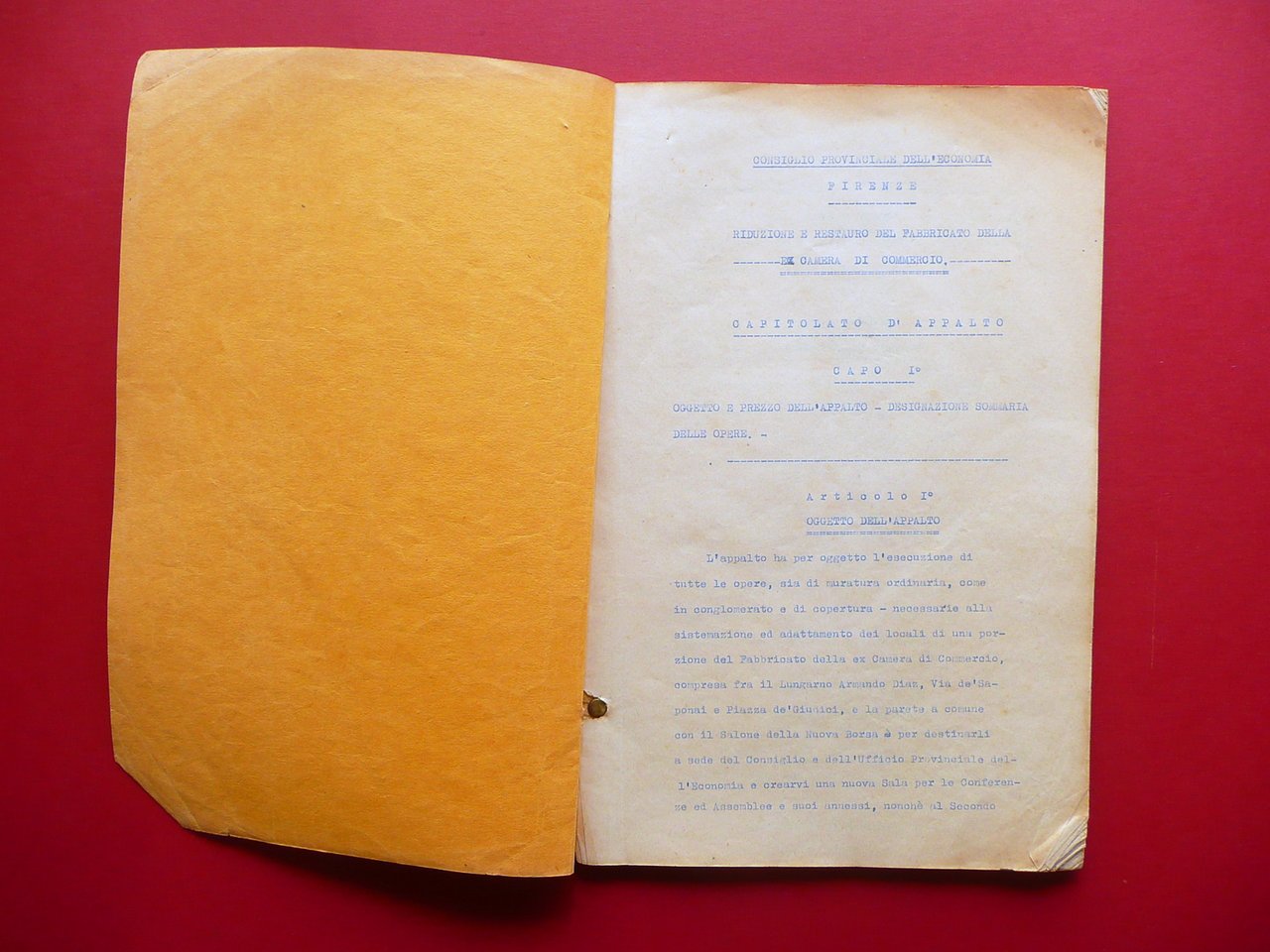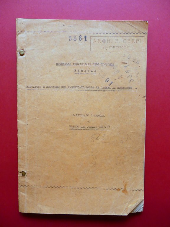 Fascicolo, Consiglio Provinciale dell'Economia - Firenze Riduzione e restauro del fabbricato della Ex Camera di Commercio Capitolato d'appalto ed elenco dei prezzi unitari - Arch. E. Cerpi - Firenze 1935; cm 30,5x20,5; pp. 71 tutte dattiloscritte, qualcuna con integrazioni / correzioni / note d'epoca a penna o a matita; brossura in cartoncino con chiodini per fissaggio; titolo dattiloscritto alla brossura ant.; timbretti numerici a entrambi i lati. Condizioni di conservazione Esemplare ben conservato con tracce d'uso, brossure con piccoli lievi aloni e tracce di sporco, dorso con pochi minimi strappetti in corrispondenza dei chiodini, esemplare compatto. Angolo inf. della brossura ant. e angoli di alcune pagine con piccole / minime pieghette. Interni con minime leggerissime bruniture. SC03.D15709 N