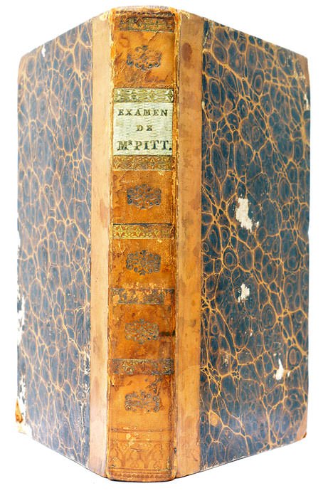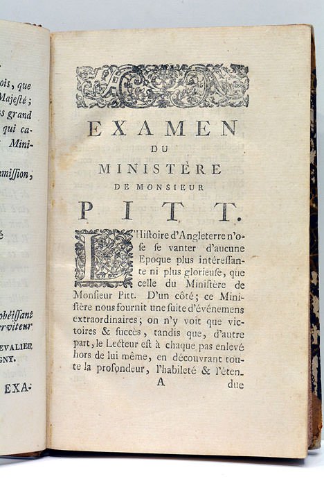 Examen du Ministère de Mr. Pitt. Dédié au Roi de Prusse. Traduit de l'anglais par le Colonel Chevalier de Champigny, avec des Notes Intéressantes. Son intention est de soumettre aux lumières du public, dont le jugement est toujours sûr, les motifs qui ont été le mobile de ses actions pendant le cours de son Ministère. La Haye, Pierre Gosse Junior et Daniel Pinet, 1764. VIII. 346pp. (Relié à la suite:) 2). MEMOIRES pour se'vir à l'histoire de la vie du Lord William Pitt, Comte de Chatham ou Examen de la Conduite d'un ci-devant Député à la Chambre des Communes. Ouvrage traduit de l'Anglois. Amsterdam, Zacharie Chatelain et Fils, 1766. 54pp.