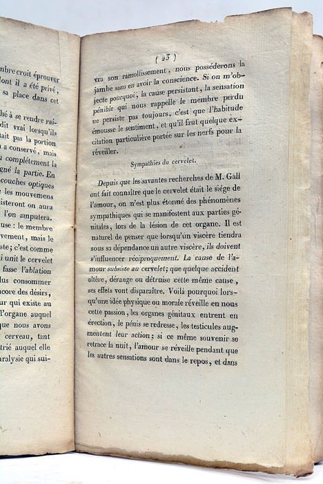 XII. 102 pages. (18,5x11 Cm). Broché. Couverture muette de l’époque. Etiquette du titre collé au dos. Accrocs et petits manques. L'auteur de cet étude des phénomènes nerveux de sympathie physiologique existant entre certains organes était chirurgien interne des hôpitaux de Paris. il s’inspirait notamment des travaux de Gall sur le cerveau et le système nerveux. Mouillure angulaire à la fin du volume. Traces de plis.
