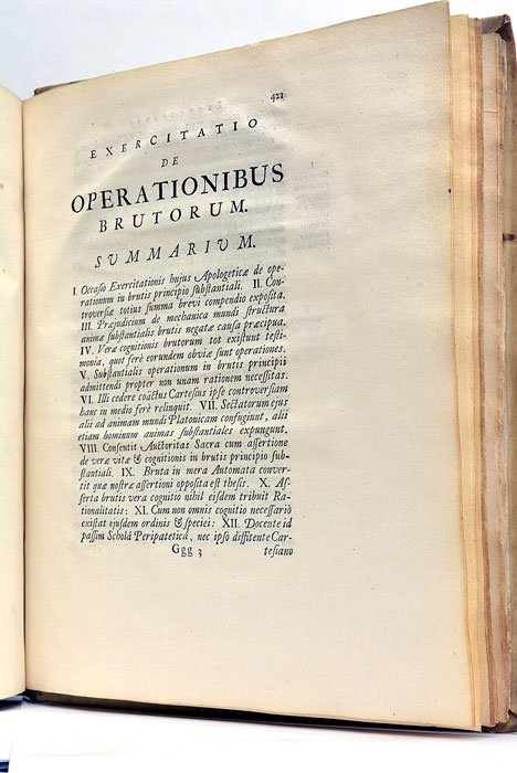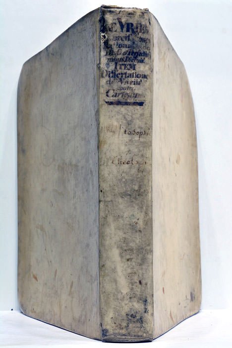 8 feuillets. 436 pages. 9 feuillets. (24,5x20 Cm). Parchemin de l’époque. Dos lisse. Auteur et titre manuscrit au dos. Coins et coiffes émoussés. Taches et salissures sur les plats. Ouvrage de Gérard de Vries professeur de philosophie à Utrech. C’est un recueil de dissertations sur la nature physique et psychologique de l’homme, sur la perception, sur les opérations de l’esprit, etc. Certains textes analysent les idées de Descartes sur ces sujets. Quelques mouillures claires. Rares rousseurs. Papier légèrement bruni. Petits accrocs.