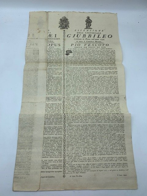 Manifesto piu' volte ripiegato (aperto misura cm 48,5 x 123 cm circa). Illustrazioni xilografiche in testa. Testo su doppia colonna in latino e traduzione italiana. Manifesto con lettera con comunicazione dell'estensione del Giubileo inviata dal Cardinale I. Conti (con tutta probabilita' Innocenzo Conti) ai fedeli. Il Giubileo del 1775 fu voluto da Papa Pio VI proprio nell'anno dell'inizio del suo pontificato. Si legge: "Esultammo.e lagrime di sincera allegrezza spargemmo piu' volte le vastissime vie di questa citta' rimirando di innumerevole moltitudine di fedeli ripiene.Perciocche' uno straordinario fervore in tutti appariva, quando in modo di processione i santi pegni della Citta' visitavano, quando le sagre Porte baciavano, e quando salmi, e inni cantando di soave armonia e di flebili voci le vie tutte riempivano.". Il Cardinale continua riferendo della visita di Massimiliano d'Austria a Roma, quindi concede la "pienissima indulgenza" e la remissione dei peccati a chi visitera' le quattro Basiliche dentro e fuori la citta' nel periodo del Giubileo.
