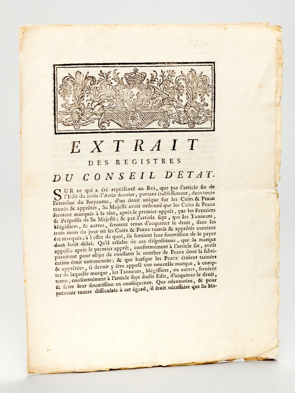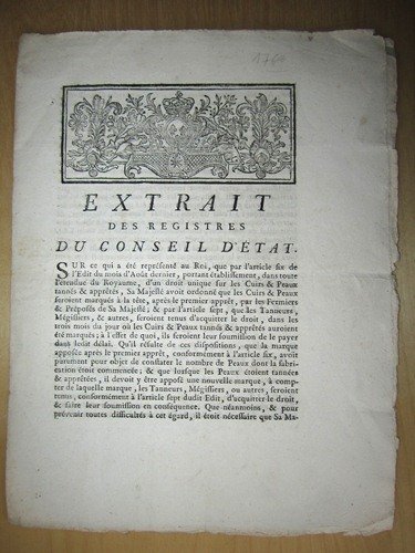 Extrait des Lettres Patentes du Conseil d'Etat. Lettres Patentes sur Arrest, Qui ordonne que les Peaux tannées & apprêtées seront marquées d'une seconde Marque après leur entière perfection, & que le droit sera payé dans trois mois, à compter de ladite Marque. Extrait des Registres de la Cour des Aides & Finances de Guienne, le 16 avril 1760