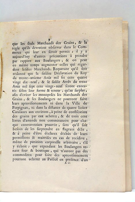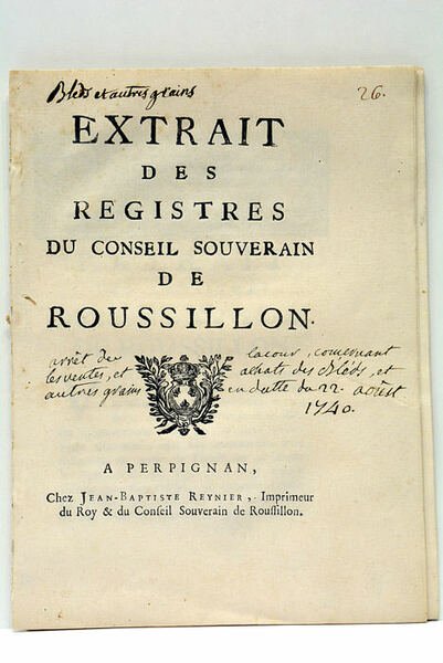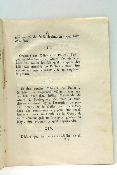 15 pages. (24x17 Cm). Dérelié. Petit trou de vers sans atteinte au texte. Dérelié en deux parties. Infimes rousseurs. Notes manuscrites en premier plat. Déchirure en marge au premier plat. Arrêt de la Cour, concernant les ventes et achats du blé et autres grains. Petites rousseurs éparses.