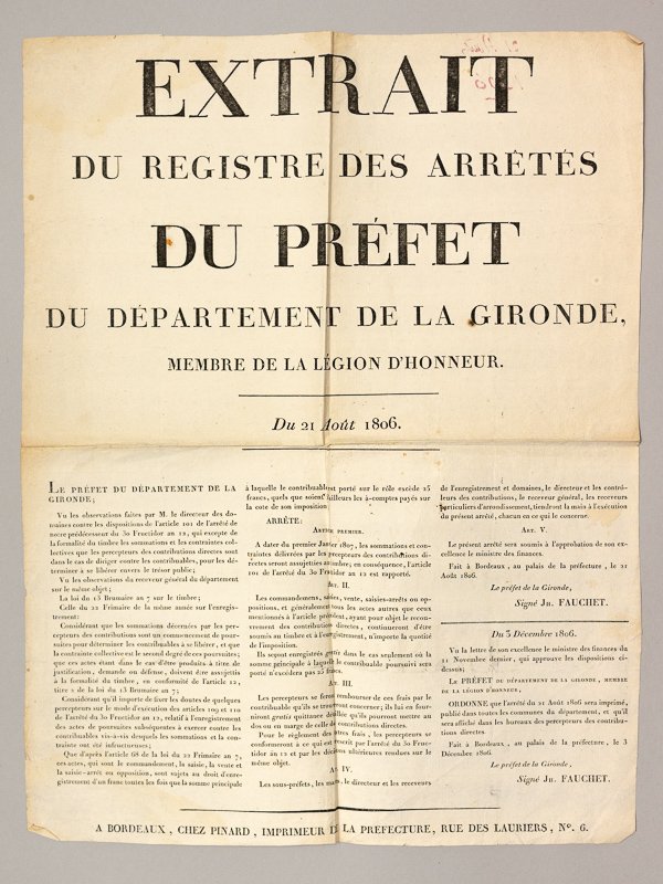 Extrait du Registre des Arrêtés du Préfet du Département de la Gironde, Membre de la Légion d'Honneur du 21 Août 1806