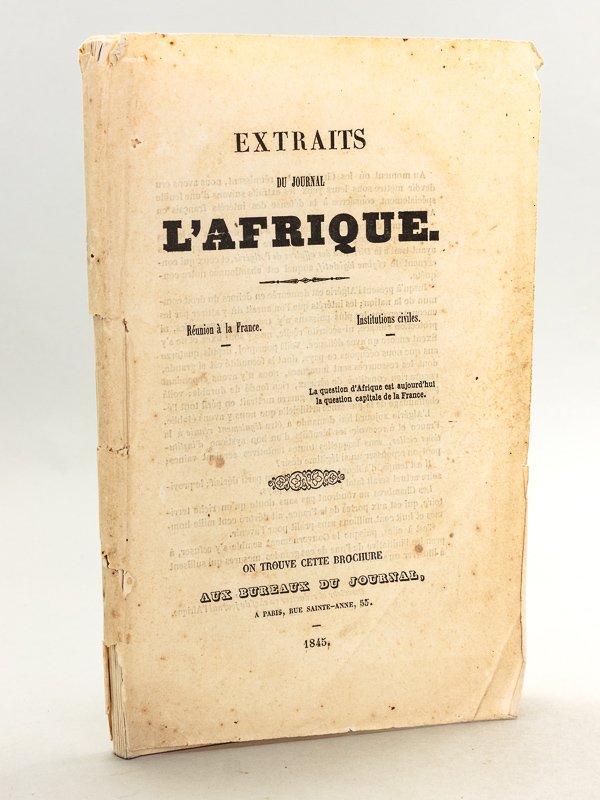 1 vol. in-8 br., "On trouve cette brochure aux Bureaux du Journal", Paris, rue Sainte-Anne, 55, 1845, 156 pp. Important ouvrage qui visait à défendre les intérêts français dans la toute récente colonie d'Algérie. "Jusqu'à présent l'Algérie est demeurée en dehors du droit commun de la nation ; les intérêts que l'on aurait dû y attirer par les encouragemens les plus puissans n'y trouvant ni garanties ni protection efficace, ni sécurité réelle, ne s'y sont fixés et ne s'y fixent encore qu'avec défiance. [ . ] L'Algérie aujourd'hui demande à être légalement réunie à la France et à recevoir les bienfaits d'un bon système d'institutions civiles, sans lesquelles toutes tentatives seraient vaines". Hippolyte Peut (1809-1889) publie ici un choix d'articles tirés du journal éphémère "l'Afrique" qu'il venait de fonder en 1844. Ce document est de toute rareté. Etat satisfaisant (couv. faible, bon état par ailleurs).