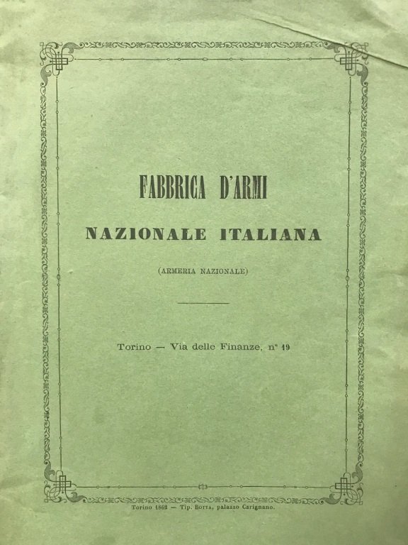 <span style="font-style: normal;">In-8° (cm. 25,8), brossura editoriale verde a stampa, pp. 21 in ottimo stato, con foglio allegato di soscrizione all'acquisto di armi da guerra e di lusso. Fondazione della prima manifattura d'armi nazionale, con </span><i>excursus</i> sull'economia d'armi da fuoco degli antichi stati (Valdocco, Torre Annunziata e opifici privati) confrontata con l'europea. Esemplare molto buono. (NJ1)