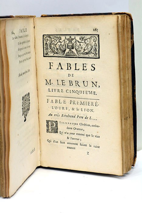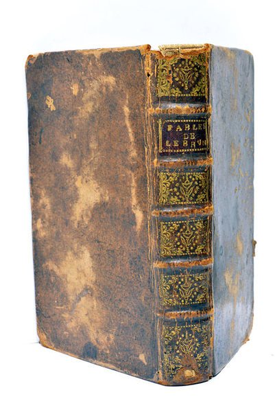 Frontispice. 18 feuillets. 356 pages. 1 feuillet. (16,5 x 10 Cm). Plein veau brun, dos à nerfs orné. Coiffes et coins usés. Charnières abîmées. Manques sur les coupes.Pages jaunies. Quelques rares tâches. Edition rare de fables de Monsieur le Brun. Joli frontispice gravé.