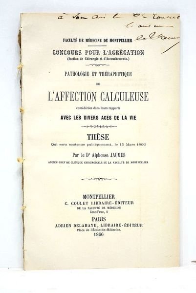 Faculté de Médecine de Montpellier. Concours pour l'agrégation (Section de chirurgie et d'accouchements.). Pathologie et thérapeutique de l'affection calculeuse considérées dans leurs rapports avec les divers ages de la vie. Thèse qui sera soutenue publiquement, le 15 mars 1866.
