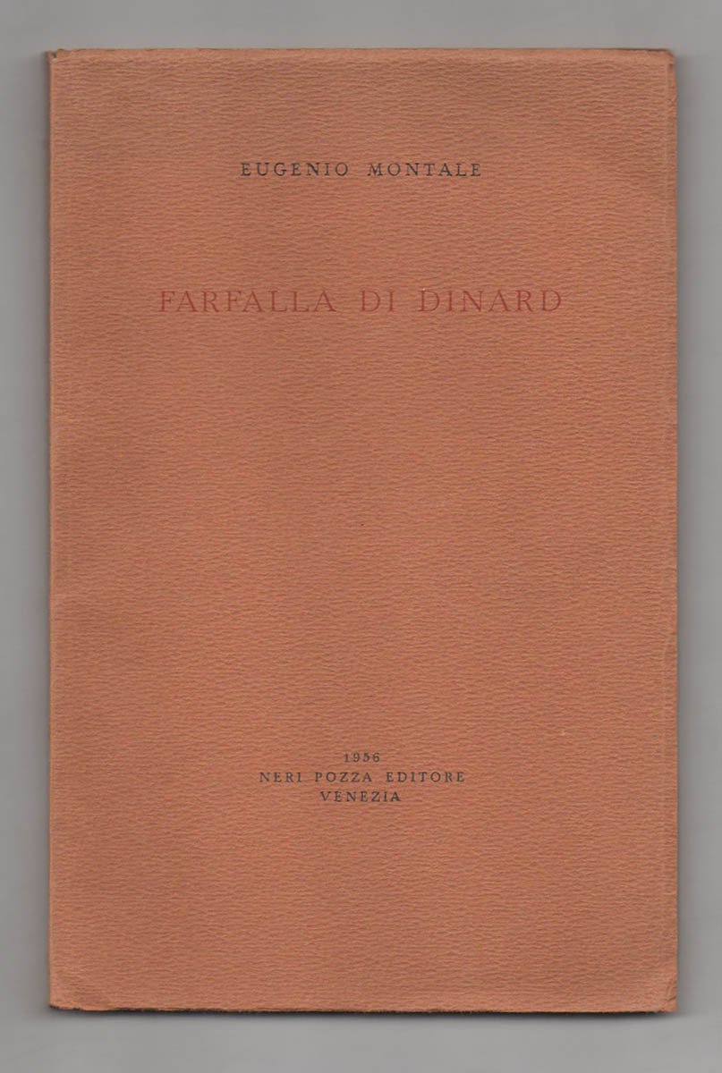 LIBROPrima edizione. Ottimo esemplare (leggerissimo segno di abrasione alla prima carta e lievissime bruniture alle carte). Iscrizione manoscritta di privato alla prima carta: «A Loly e Luciano, ‘in tender embassy of love’, nella Pasqua del 1957[.] Paolo». «In tender embassy of love» è preso dal sonetto 45 di Shakespeare.Raccolta dei bozzetti, elzevirini e culs-de-lampe pubblicati tra il 1947 e il 1950 sul «Corriere della sera» e il «Corriere d’informazione». Volume stampato in 450 esemplari fuori commercio in occasione del Natale 1956. Il titolo prende spunto dal racconto eponimo della raccolta, in cui Montale narra di come venisse tutti i giorni a trovarlo una farfalla quando alloggiava a Dinard (una cittadina in Bretagna).Barile, Bibliografia montaliana, n. 83