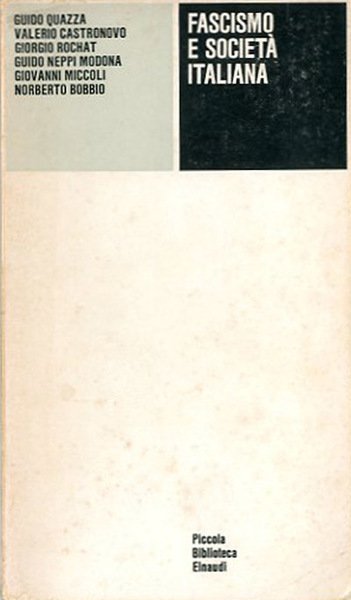 253 p. ; 18 x 11 cm. Piccola biblioteca Einaudi. Questo volume con contributi di vari autori (V. Castronovo, G. Rochat, G.N. Modona, G. Miccoli, N. Bobbio) offre un ventaglio di interpretazioni sui rapporti tra fascismo e società italiana nei suoi aspetti culturali, sociologici, economici e politici. Indice: Introduzione. Storia del fascismo e storia d'Italia; Il potere economico e il fascismo; L'esercito e il fascismo; La magistratura e il fascismo; La Chiesa e il fascismo; La cultura e il fascismo. Brossura editoriale, copertina in cartoncino flessibile colorato (b/n e verde). Firma ms. di appartenenza nell'anteporta con data. Codice libreria 4276.