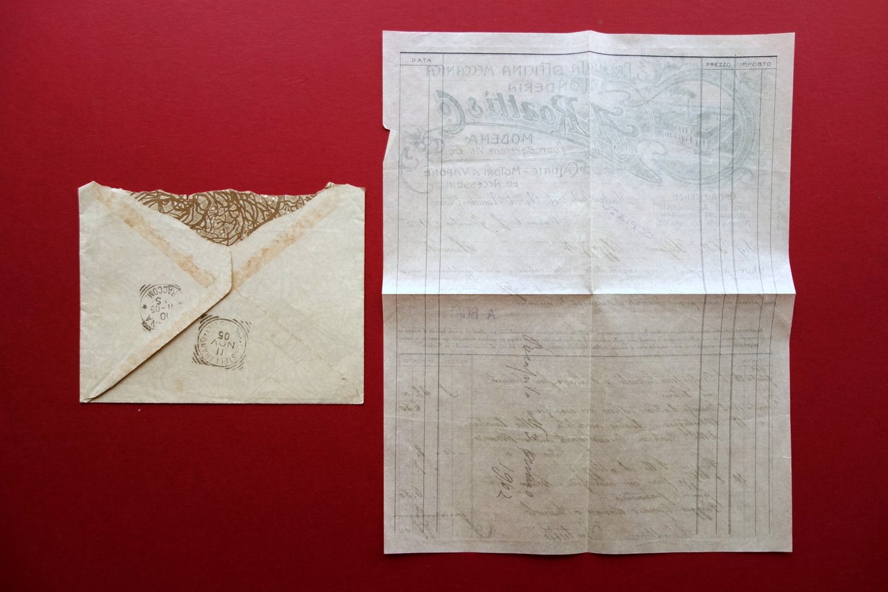 Fattura con busta di spedizione, Premiata officina meccanica e fonderia A. Roatti e C. - Modena fuori barriera Vittorio Emanuele caldaie - motori a vapore - accessori macchine industriali - agricole - vinicole - olearie datata 1905 Fattura d'epoca su carta simil velina, con bella intestazione in monocromia (verde); sezioni bianche compilate manualmente. Retro bianco. Cm 28x22. Acclusa busta originale per spedizione postale, anch'essa con bella intestazione litografica (vedi foto). Condizioni di conservazione Fattura in buone condizioni con tracce d'uso, normali pieghe di spedizione, margine esterno destro con un minimo strappetto. Busta originale di spedizione ben conservata, con normale mancanza alla parte superiore dovuta all'apertura della missiva (vedi foto). SC03.D16132 N
