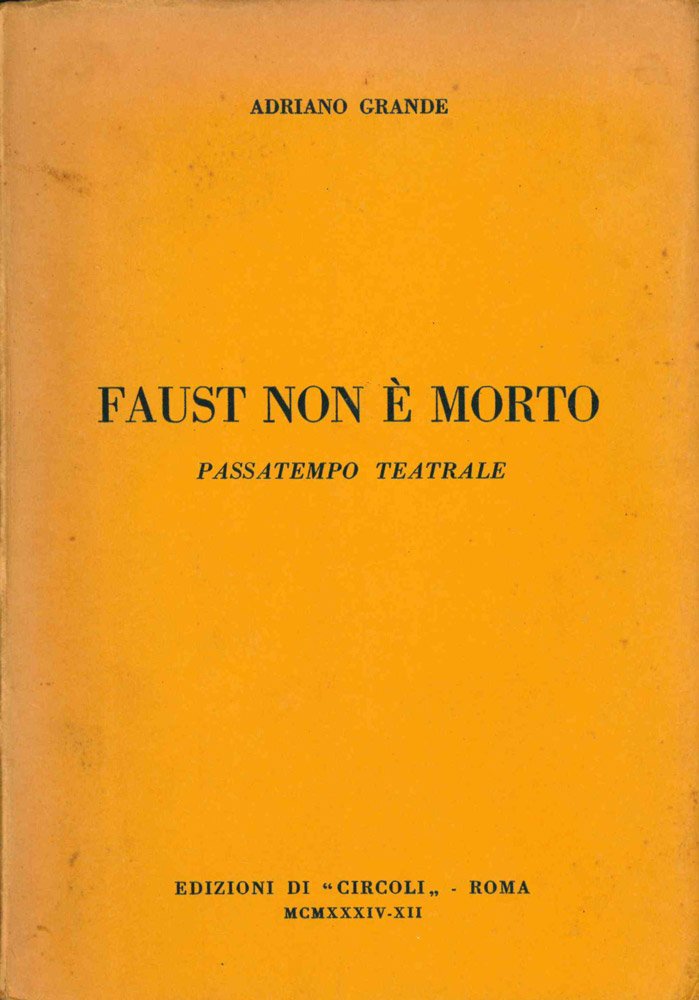 LIBRO Prima edizione. CON AUTOGRAFO. Esemplare numero 199 di 500 (normale e marginale brunitura alle carte, nel complesso in ottimo stato) pregiato da dedica autografa alla scrittrice pisana Paola Masino. Prima e unica opera drammaturgica di Adriano Grande pubblicata – a cura dello stesso poeta ligure – delle Edizioni di “Circoli” nel 1934 in cinquecento esemplari numerati. Rappresentato l’anno successivo a Roma, il testo – in cui compaiono, oltre al Faust goethiano, Wagner, Amleto, Don Chisciotte, Sancio Pancia, Don Giovanni, Leporello, Pangloss, … - intendeva riprendere il teatro di poesia, per altro già praticato da Gabriele D’Annunzio come forma di ribellione ai vincoli del teatro borghese e di libertà stilistica e formale. E anche qui, la libertà si esprime attraverso una bizzarra di sinfonia di personaggi impegnati in fitti scambi esistenziali, filosofici e metateatrali chiusa dall’epilogo «Cura di vecchiaia».