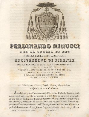 Ferdinando Minucci per la Grazia di Dio e della Santa Sede Apostolica Arcivescovo di Firenze della Santità di N. S. Papa Gregorio XVI.