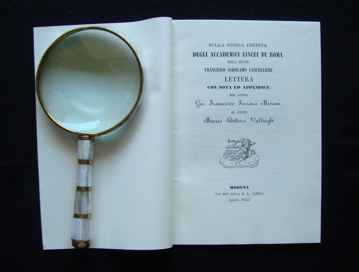 Opuscolo, Sulla Storia Inedita DEGLI ACCADEMICI LINCEI DI ROMA Dell'Abate Francesco Girolamo Cancellieri Modena, coi tipi della R.D.Camera, 1855; cm. 21,5x15; pp. 24; br. ed. OTTIMA; Edizione di 50 esemplari fuori di commercio ns/ n 24. Condizioni di conservazione Esemplare in ottimo stato. Lettera con Nota e Appendice del Conte Gio Francesco Ferrari Moreni al Conte Mario Dottore Valdrighi OPEB.4408 blu
