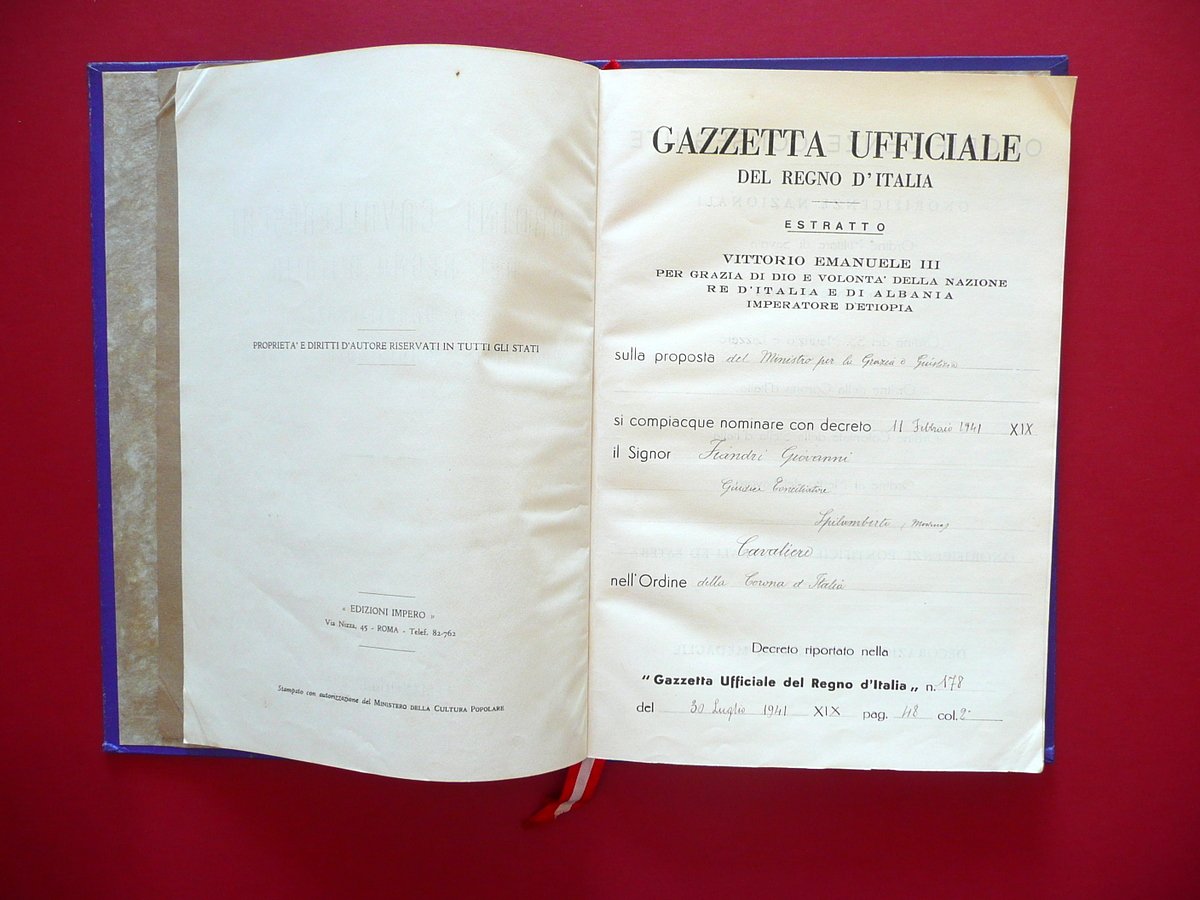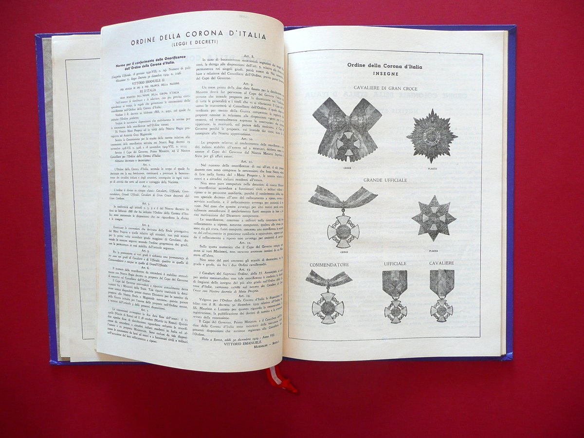 Estratto della nomina del signor Fiandri Giovanni di Spilamberto (provincia di Modena) a Cavaliere dell'Ordine della Corona d'Italia in Ordini Cavallereschi del Regno d'Italia ed onorificenze pontificie, magistrali ed estere" Edizioni Impero, 1939 (l'estratto della nomina è datato a mano 30 luglio 1941); cm 32x22; pp. 96 con alcune ill. in b/n fuori t. e nel t.; tutta tela ed. con titolo e fregio impresso in oro al piatto ant. Segnapagine in stoffa bicolore. Condizioni di conservazione Esemplare complessivamente in buono stato con tracce d'uso; angoli dei piatti con minuscoli difetti; piatto post. con qualche lieve alone. Cerniere interne (principalmente quella anteriore) fessurate, con conseguente minimo parziale distacco del corpo del testo dalla legatura; interni peraltro compatti e ben conservati. Angolo sup. del risguardo ant., del frontespizio e dell'attestato con tracce di piccole pieghette. In apertura, subito dopo il frontespizio, l'attestato di cui sopra. Compilazione a mano, con datazione al 1941 (Il testo è datato 1939). SETT182.L17067 N "