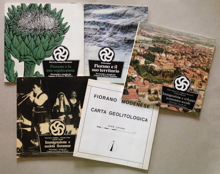 AA. VV., 5 Fascicoli: M. Bertolani: Fiorano e il suo territorio" D. Bertolani Marchetti: "Fiorano e la sua vegetazione" Sigillino, Zorzi, Dondi: "Immigrazione e società fioranese" Mantovani, Marzaroli, Pellicciari: "Immigrazione e sviluppo economico-sociale" Carta Geolitologica: scala 1:10.000 Documenti e ricerche del Comune di Fiorano Modenese, 4 fascicoli + 1 carta: 1980, 1983, 1984, 1985; cm. 20,5x20,5; pp. 24, 36, 79, 72; con ill. fot. in b/n e a col. n.t. e a piena pag.; carta geolitologica, scala 1:10.000; brossure editoriali ill. a col. Condizioni di conservazione Volumi in buone condizioni di conservazione con leggere tracce d'uso. SETT196.L16848 MT "