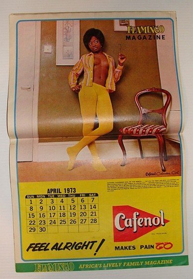 - Flamingo - Africa's Lively Magazine, Volume 12, No. 1 Colour centerfold featuring Niki Valentine, Ghana Airways ad inside front cover, Colour FIAT ad, Exclusive report on Uganda's General Idi Amin entitled "How I, Transformed Uganda into a Black Man's Country", with photos, Idi Amin's views on love and marriage, and love without marriage, Nigeria's Popular Civilian Crusades Against Disease and Filth -, Alhaji Aminu Kano, Kenya Rocked by Wild Rumours Following Death of Minister Ronald, Gideon Ngala - several photos and article, Centerfold photos and article on Niki Valentine - the Topless, Teacher from Nigeria, Colour Vespa ad, When a man becomes his own wife! - Professor and Lady Peller -, many photos and article, 'Alone in the World' - fiction by Harmattan Nwabueze, New African-made car that won't get stuck in traffic jams -, Professor Awodele Awojobi is the brains behind a car with, steering wheels at each end!, Pretty African girl, Maria Prabhu of Nairobi, invades all male religious sect - Hare Krishna Temple - article, and photos, Colour ad for Star Beer Nigeria Africa Magazine Back Issues
