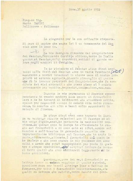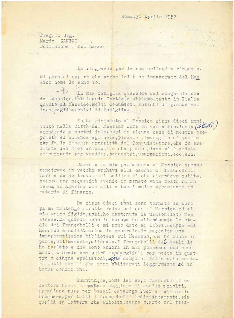 22x28 cm, 49 righe dattiloscritte su 2 facciate in cui il principe offre, probabilmente ad un commerciante, francobolli della sua collezione ". al Messico spesso penetravo in vecchi archivi, alla caccia di francobolli."