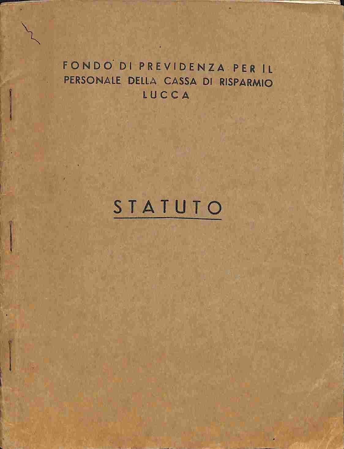 In 8 (cm 18,5 x 24), pp. 32 stampate al solo recto (verso dei fogli bianco). Brossura editoriale con punti metallici al dorso. Alcuni segni a matita o penna nel testo. Firma e data manoscritte al primo foglio. Statuto in 51 punti della Costituzione del Fondo di previdenza per il personale della Cassa di Risparmio di Lucca nato dalla fusione del Fondo speciale pensioni per il personale della Sede centrale della Cassa di Risparmio di Lucca con il Fondo di previdenza per il personale delle filiali ed agenzie. Non e' indicata nel documento la data ma, da riferimenti interni, si desume essere il 1942.