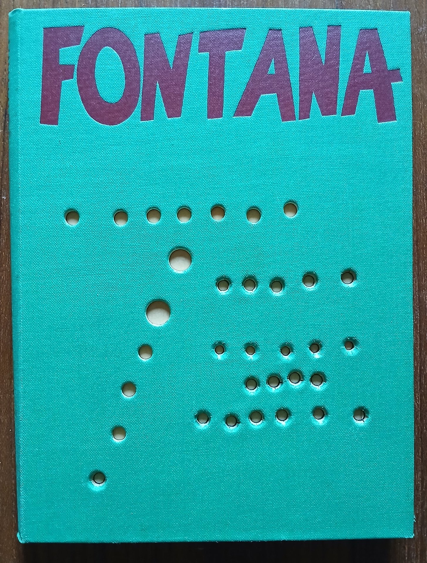 - legatura editoriale in cartone e tela verde con fustellature eseguite su progetto di Fontana al piatto anteriore, titolo impresso in rosso al dorso ed a piatto anteriore
