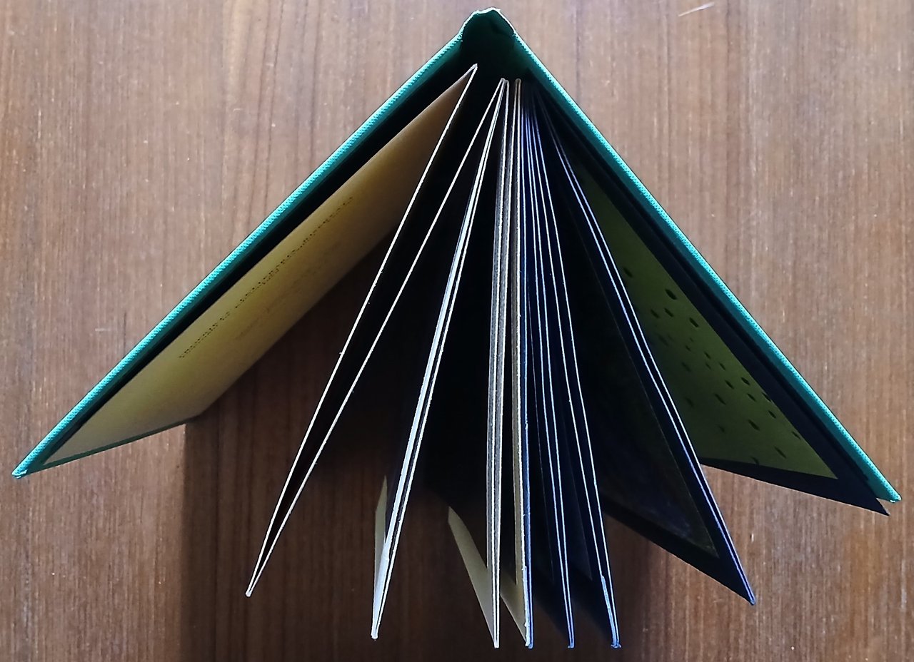 In 16° grande (cm 19 x 14), legatura editoriale in cartone e tela verde con fustellature eseguite su progetto di Fontana al piatto anteriore, titolo impresso in rosso al dorso ed a piatto anteriore. Volume a leporello composto da 15 carte, in colore giallo le prime sette, in nero le restanti. Le prime due carte non numerate contengono un testo di Giampiero Giani tratto dal volume “Spazialismo” ed una biografia dell’artista, alle carte numerate da 3 a 15 una fotografia di Ugo Mulas che ritrae Lucio Fontana nel cortile del suo studio a Milano e 12 riproduzioni fotografiche a colori di opere applicate al recto. Indice posto al verso di carta 15. Edizione numerata di 600 esemplari stampata per le Edizioni del Cavallino nel giugno 1958. Esemplare n. 376 nella versione in tela verde, stato di conservazione molto buono.