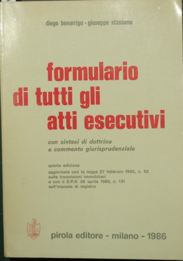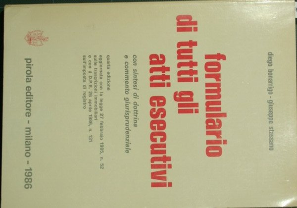 Con sintesi di dottrina e commento giurisprudenziale - Quarta edizione aggiornata con la legge 27 febbraio 1985 n. 52 sulle trascrizioni immobiliari e con il T.U. sull'imposta di registro (D.P.R. 26 aprile 1986, n. 131) - in 8° - pp.XV + 374 - Brossura editoriale