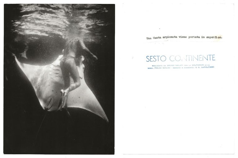 Una Manta arpionata da Vailati (?) viene portata in superficie. Foto originale per Sesto Continente realizzato da Bruno Vailati per la Delphinus SpA. Regia: Folco Quilici - Edizione e commento di G. G. Napolitano. 18x24. Rara e in Stato di Nuovo.