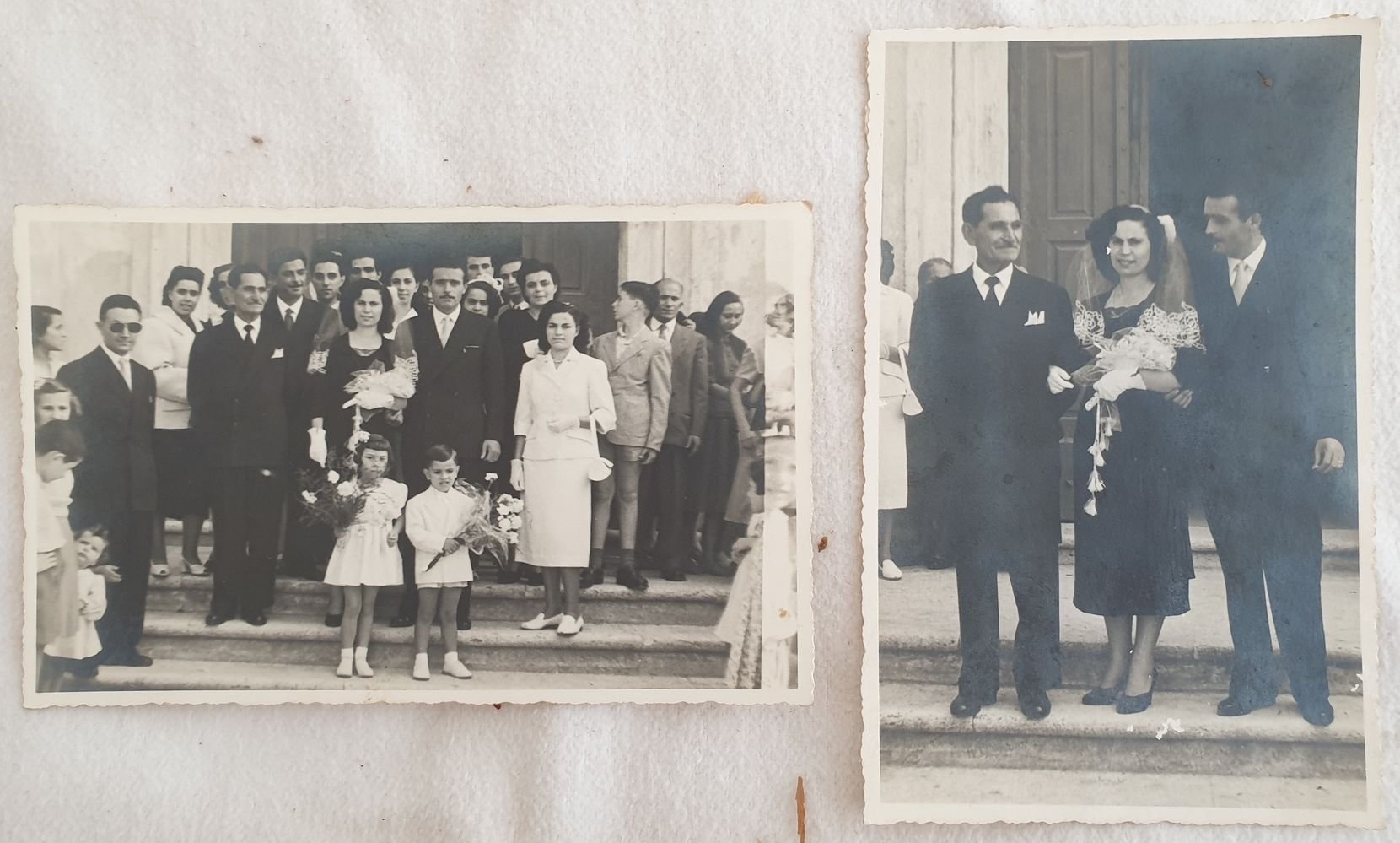 Lotto di due fotografie degli anni '50 in formato cartolina di un matrimonio nel ternano. La Chiesa dovrebbe essere Santi Pietro e Cesareo di Guardea. Al verso timbro "Foto Diamanti Terni". Dimensione cm 8,5x13,5.Lot of two photos in card format of a marriage in terni area. Tyhe Church should be Santi Pietro e Cesareo in Guardea. In the verso stamp "Foto Diamanti Terni". Size cm 8,5x13,5.<BR><BR>