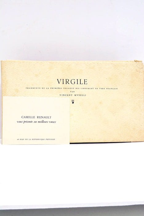 6 feuillets non coupés. (11x20 Cm). Broché. Couverture imprimée, rempliée. Quelques petites salissures. Ces vers de Virgile, traduits librement par Vincent Muselli. Cuivre original signé au crayon sur le frontispice par Manuel Robbe. Tirage à 100 exemplaires hors commerce, tous numérotés sur papier d'Angoumois et réservés aux amis de Camille Renault. Notre exemplaire est le nº 15. Carte de "meilleurs vœux" de Camille Renault. Broché en très bon état.