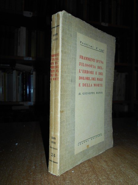 Rensi, Giuseppe. Modena, Guanda Editore, 1937. Frammenti d' una Filosofia dell' Errore e del Dolore, del Male e della Morte. In-16°, br. orig. 208 pp. Normali segni del tempo ma ben conservato. Neg. esot. mob. 102