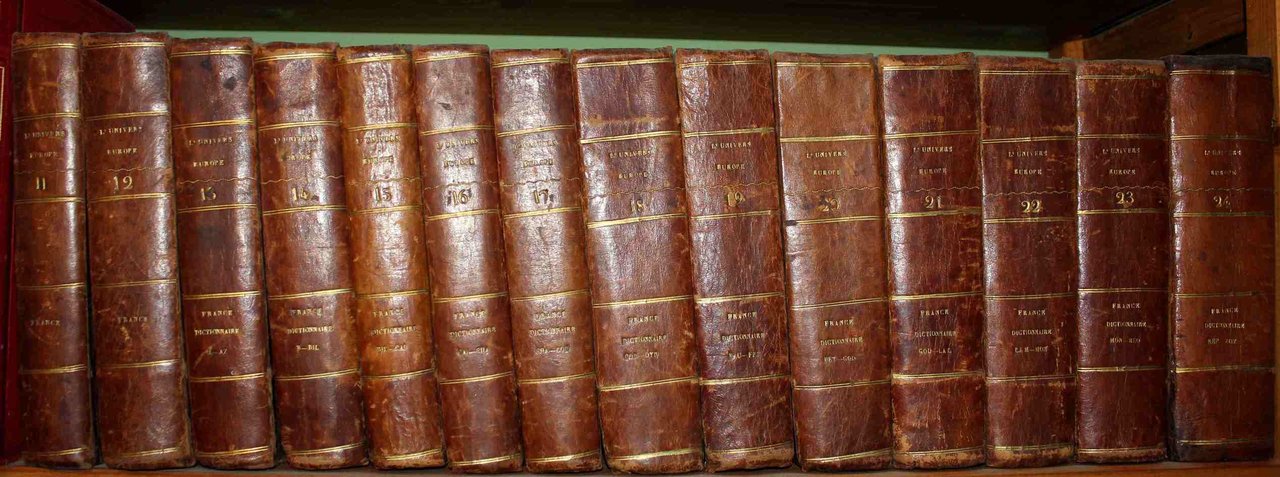 14 volumi in 8° (2 volumi: Annales Historiques; 12 volumi: Dictionnaire Encyclopedique). Con 24 tavole doppie di carte geografiche (negli 'Annales') e 619 tavole fuori testo con vedute di città, costumi, monumenti, numismatica (alcuni numeri sono doppi, altri mancano, come spesso accade). Qualche fioritura ma buon esemplare. Testo su due colonne. Leg. dell'epoca mezza pelle, dorsi con titoli oro (L'Univers - Europe - num. da 11 a 24 - France - Dictionnaire).