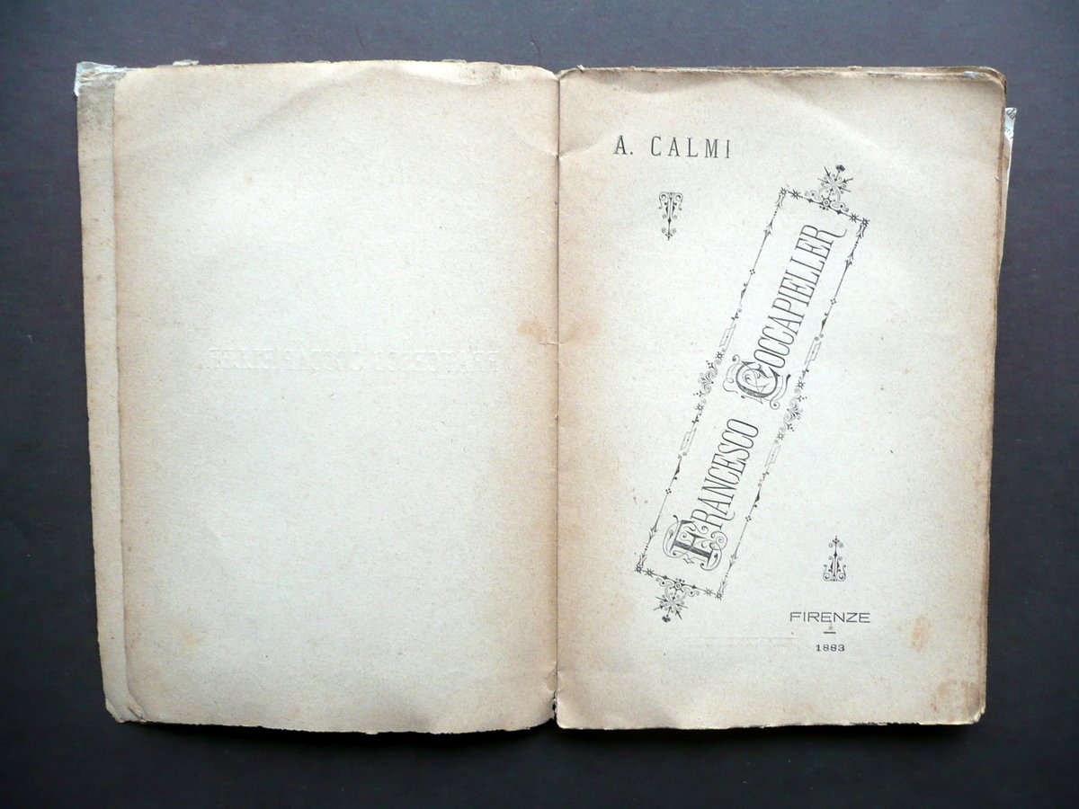 A. Calmi, Francesco Coccapieller Firenze 1883; cm 19x12,5; pp. 74; brossura ed. d'attesa. Condizioni di conservazione Esemplare in modeste condizioni con tracce d'uso e del tempo, alcune leggere ingialliture, piccoli lievi aloni e bruniture; dorso in larga parte mancante con conseguente distacco delle brossure e allentamento delle cuciture (vedi foto); margini e angoli delle brossure con qualche piccola mancanza, in qualche caso oggetto di restauro mediante l'applicazione di striscia di carta (vedi foto); margine sup. della prima bianca con uno strappetto di qualche cm restaurato con carta giapponese. OPEB.3776 N