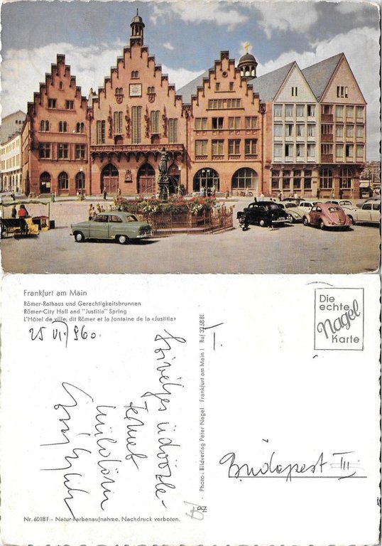 Frankfurt am Main. Romer-City Hall and Justitia Spring. Viaggiata 1960
