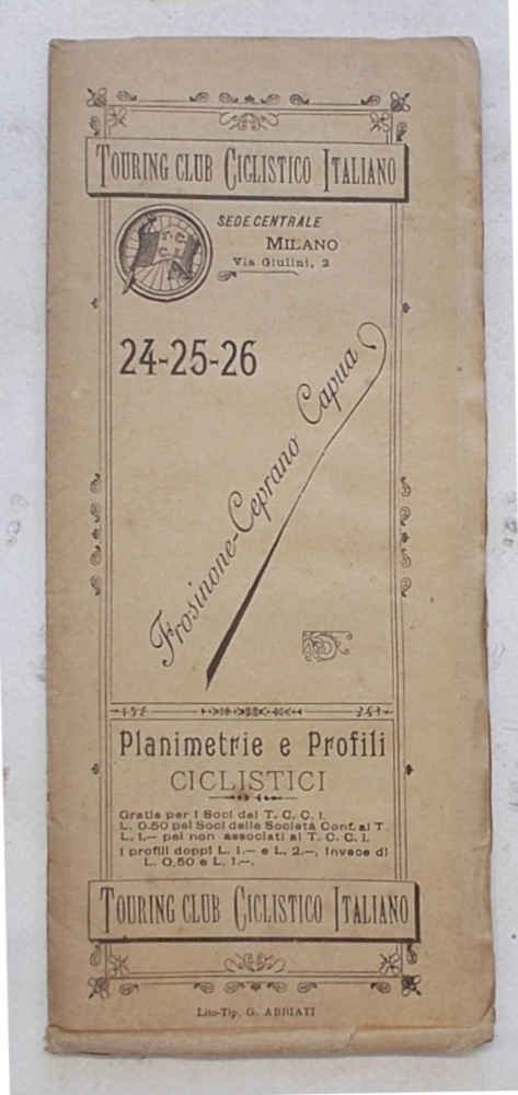 Tavola di 24 facciate di cm. 21 x 8,5 (perciò lunga cm. 204 circa). VG. ** Verificato sul terreno nel febbraio 1897. Le "Planimetrie e profili ciclistici" del Touring Club Ciclistico Italiano sono una collezione di pubblicazioni che ha qualcosa, anzi è più esatto dire molto! di epico: i 57 itinerari, pubblicati in 51 fascicoli tra il 1896 e il 1901, Luigi Vittorio Bertarelli, il fondatore del T.C.I., se li è fatti tutti in bicicletta, appuntando ogni informazione utile su un taccuino. Ogni itinerario è descritto su una lunga tavola, che si svolge orizzontalmente e che è ripiegata in una copertina con titoli, fregi e piccolo stemma del T.C.C.I. La tavola presenta un profilo altimetrico a tre colori e la cartina dell'area, con il tracciato evidenziato in rosso. Il profilo, oltre alle quote, contiene l'indicazione delle distante, della qualità delle strade (polverose, discrete, buone.), delle tappe e altre notizie utili (sorgenti, "splendido panorama", hotel, ristoranti, servizi postali.).
