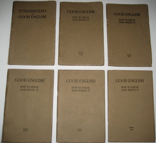 Six booklets in total. A little highlighting to the first - 'Fundamentals of Good English'. No marks or inscriptions to any of the other five. Minor creasing to oversize parts of brown paper covers only. Six very clean very tight booklets with unmarked boards and slight rubbing to spines. Total of 384pp. First book covers Punctuation and Fundamental Grammar and Good English Usage. The other five booklets cover Self-Expression : Conversation with sub-headings of Spelling, Pronunciation, Punctuation, Correct Usage, Literature and Life and Vocabulary. Undated ca 1938.