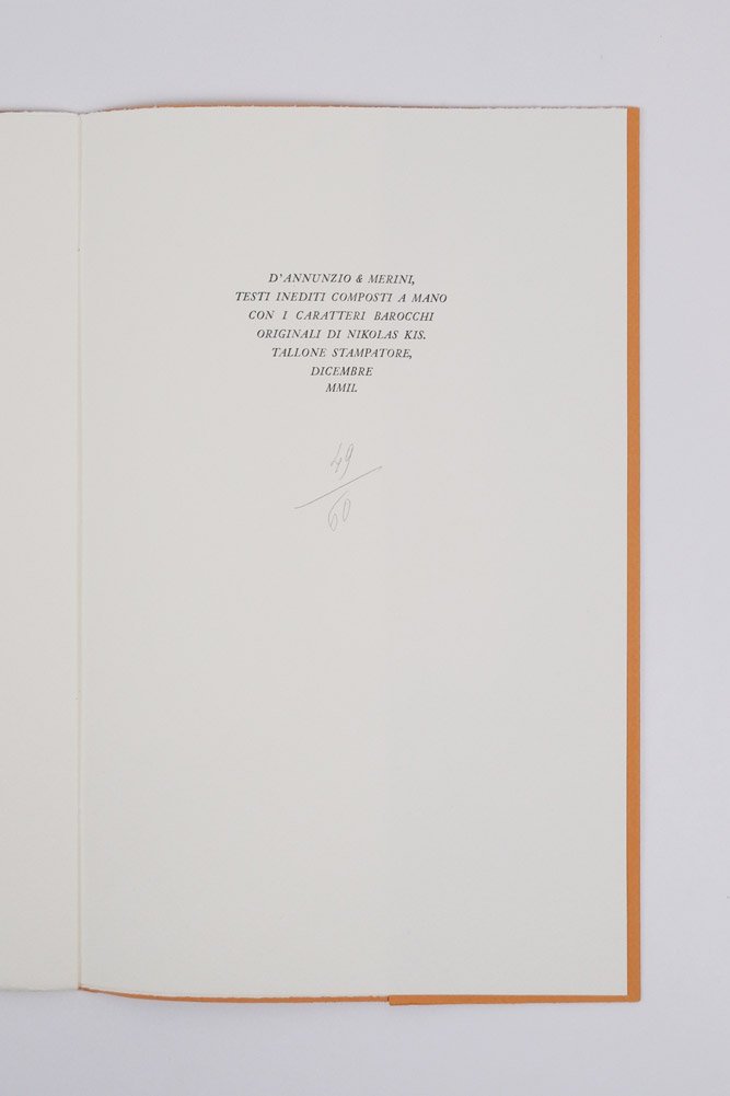 LIBROEdizione originale.Esemplare 49 di soli 60 numerati a mano, in ottime condizioni.Due inediti, tirati in soli 60 esemplari numerati a mano e confezionati in raffinata carta e astuccio; il primo, di D’Annunzio, reca la data 26 III 1930: è una breve poesia (o più probabilmente una bozza) sulla percezione dell’aurora da parte del poeta che lavora di notte; il secondo, della Merini, è un testo in prosa sulle sensazioni che suscita in lei il cielo «quando s’aggiorna». Testo impresso «con i caratteri barocchi originali di Nikolas Kis».