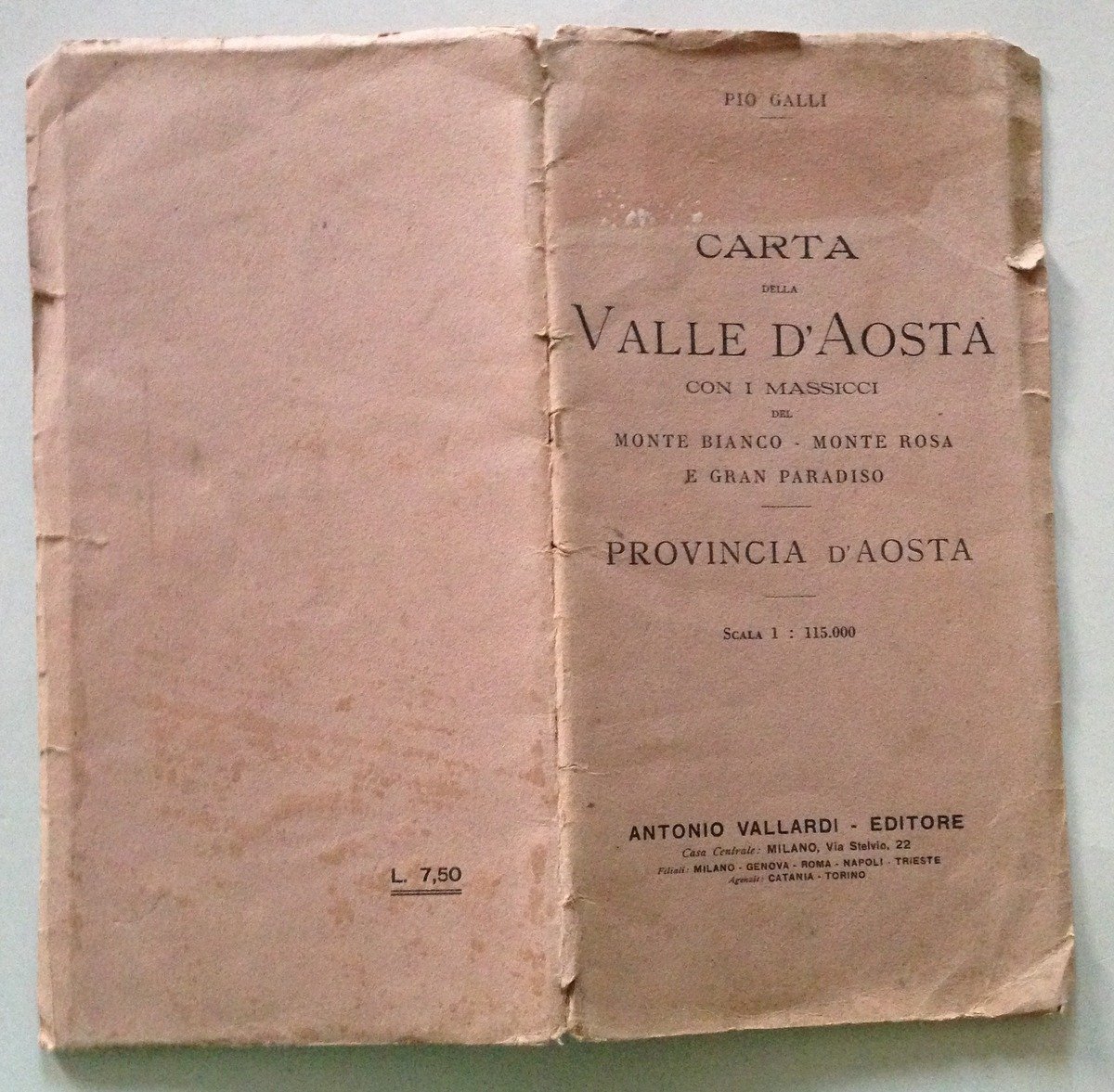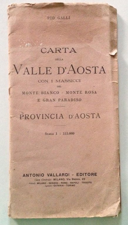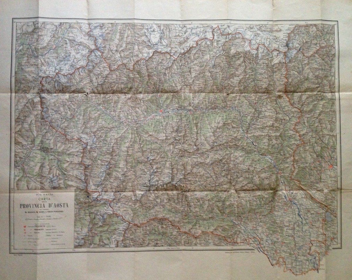 P. Galli, Carta della Valle d'Aosta con i massicci del Monte Bianco - Monte Rosa e Gran Paradiso Vallardi Editore, Milano s.d.; cm. 25,5x13; carta della Valle d'Aosta con i massicci Monte Bianco, Monte Rosa e Gran Paradiso, Provincia d'Aosta; Scala 1:115.000; br. ed. Condizioni di conservazione Esemplare in buono stato con leggere tracce d'uso; brossura editoriale con alcuni strappetti, pieghette e con minime mancanze agli angoli. OPEB.4643 MT