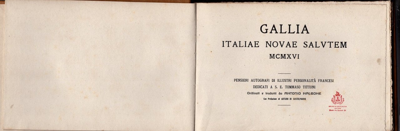 Gallia Italiae Novae Salutem 1916. Pensieri Autografi Di Illustri Personaggi Francesi Dedicati A S.E. Tommaso Tittoni *