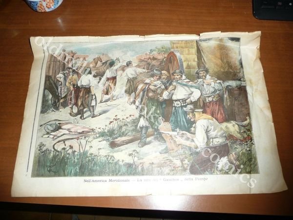 DESCRIZIONE: La Tribuna Illustrata della Domenica, Roma, Anno VII n. 3 (15 Gennaio 1899). COPERTINA: 9 Gennaio. - Alla tomba del padre della Patria. (Garibaldino che si reca in visita) Ill. Romagnoli e Zaniboni RETRO: "Nell'america meridionale. La vita dei Gauchos della Pampa" (ill. sconosciuto). La Tribuna illustrata fu un settimanale italiano pubblicato a Roma. Fondato nel 1890 come supplemento del quotidiano La Tribuna, il primo numero uscì il 6 gennaio. Il formato della rivista era 27x38 cm e ogni numero conteneva 16 pagine. In breve tempo divenne il primo settimanale illustrato italiano. Nella prima metà del XX secolo, rivaleggia con il settimanale del Corriere della Sera, La Domenica del Corriere. CONDIZIONI: DIscrete, giornale un po spiegazzato che se rimesso sotto dei pesi ritorna allo stato di nuovo. Non spillato. PESO / WEIGHT: 150 gr. without package