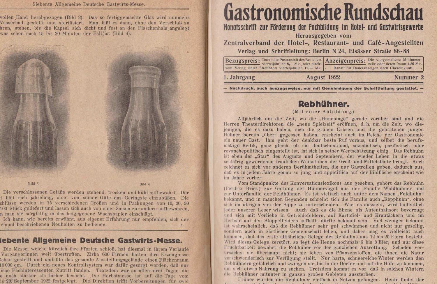 Vier Jahrgänge, vom 1. Heft vom Juli 1922 bis zum Heft 12 vom Dezember 1925. Mit einigen sw Abbildungen. Die Monatsschrift hatte sich zum Ziel gesetzt, alle Fachgebiete der Gastronomie und Hotellerie zu erreichen, beratend und weiterbildend und zur Auflockerung mit belletristischen Ergänzungen und kulinarischen Glossen (von Hermann Löns, Karl Ettlinger u.a.). Die Themen waren sehr vielfältig: Erklärung von Fachbegriffen, Erläuterungen von lebensmittel-chemischen Vorgängen, Zusammenstellung von Speisekarten, Nährwert-Tabellen, Kochschule, Betriebswirtschaftliches aus der Hotelbranche, Vorstellen von Nahrungsmitteln, Anleitungen zur Zubereitung von Wild, Diverses zu Vergiftungen und Vieles mehr. Das Blatt erschien bis Mai 1933.