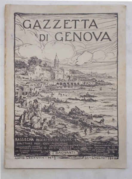 In 4° (cm. 29 x 20,5); pagg. 24 + (8) di pubblicità illustrata; con numerose illustraz. e vignette n.t.; bella leggera cartonatura origin. con copertina di G. Mazzoni "I bagnanti". VG. ** Anno LXXXVIII - n. 7 - 31 luglio 1920. Contiene, tra l'altro: La dialettale genovese "Gilberto Govi" di G. Passini di pagg. 5 - La Valle di Recco di F. Terrile di pagg. 3.