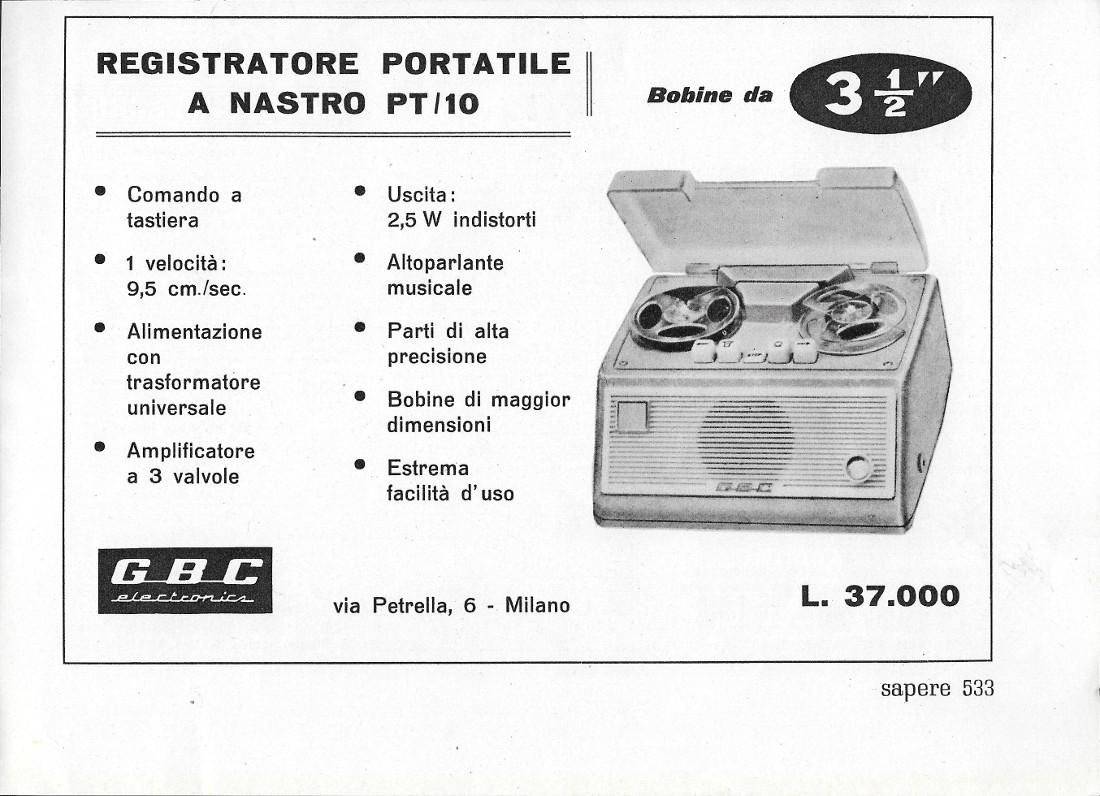GBC. Registratore portatile a nastro PT/10. Advertising 1959