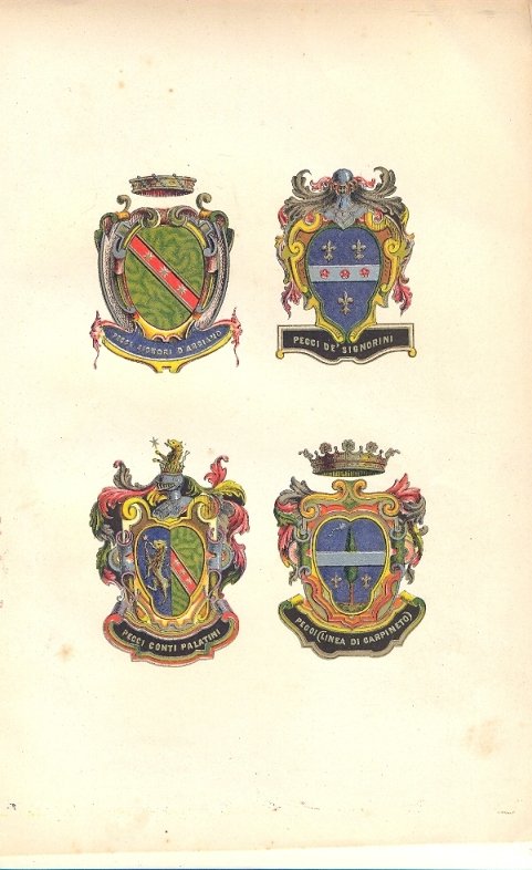 In 4°, m. pelle, pp. 132, 5 alberi genealogici, XV tavv. di stemmi in b. e n. , 1 tav. di stemmi cromolitografica, 4 ill. Antip. con ritratto di Leone XIII. Front. con scritte in oro e stemma a colori. Lettere e fregi al d. in oro Rare fioriture. Sciolta la tav. che raffigura Palazzo Pecci.