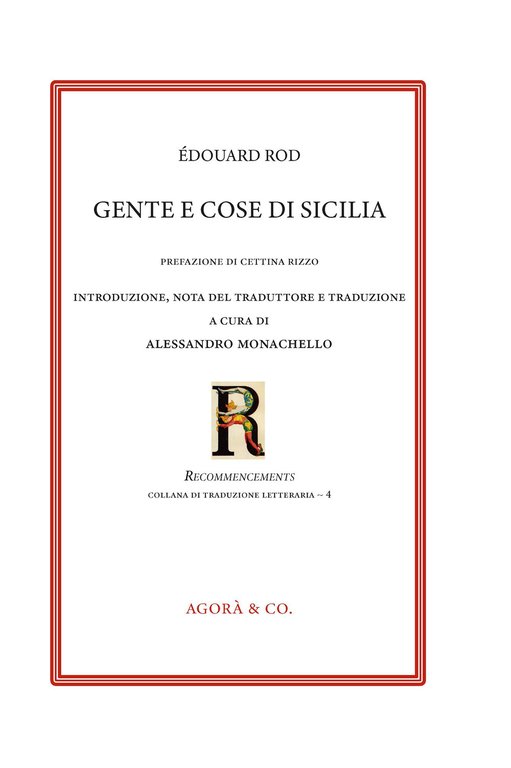 La traduzione curata da Alessandro Monachello di "Gens et choses de Sicile" di Édouard Rod si colloca all’incrocio tra filologia, storia letteraria e riflessione teorica sulla prassi traduttiva come atto fondativo della comunicazione. Non si tratta soltanto di rendere accessibile un testo rimasto finora periferico nel panorama critico francese e italiano, ma di restituire il senso di un’opera che nasce dall’incontro tra due sensibilità, quella dello scrittore svizzero e l’altra del siciliano Giovanni Verga, e che testimonia la fortuna europea del Verismo. Rod, infatti, è il traduttore francese de I Malavoglia e queste pagine evidenziano l’importanza della conoscenza diretta dell’isola a tre punte come esperienza fondativa. Rod, tuttavia, non descrive la Sicilia come semplice scenario pittoresco ma la osserva nella sua concretezza sociale e simbolica, cercando di mettere in luce il legame profondo tra i Vinti e l’elaborazione artistica verghiana. In ciò risiede la peculiarità del testo: esso non è solo un reportage, ma un vero e proprio documento critico, che restituisce dall’interno la percezione di un Verga europeo, ponte tra il particolare e l’universale.